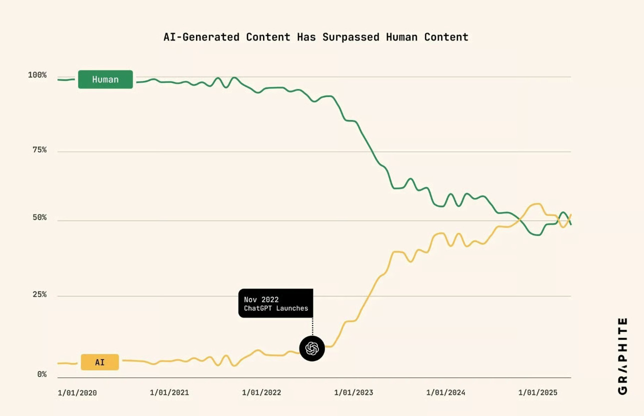 Graphite tarafından yapılan yeni bir araştırma Mayıs 2025 itibarıyla internetteki tüm makalelerin %50'sinden fazlasının yapay zeka tarafından üretildiğini ortaya koydu. Google arama sonuçlarının zirvesinde hala %86 oranında insanlar tarafından yazılan makalelerin yer aldığı tespit söyleniyor.