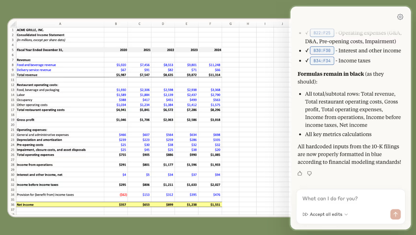 Anthropic, Claude'u Excel'e entegre etti. Claude, Excel içinde kenar çubuğunda çalışarak çalışma kitaplarını okuma, analiz etme, düzenleme ve oluşturma yeteneğine sahip.